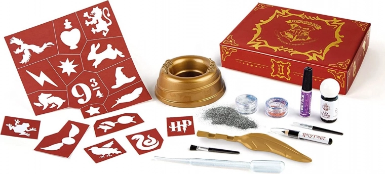 Opdag en kreativ verden af magi med HARRY POTTER tatoveringsstudio, som lader børn skabe originale, midlertidige tatoveringer på en sikker måde. Takket være det rige tilbehør, skabeloner og glimmer opstår fortryllende motiver inspireret af trolddommens univers. Nemt at påføre og overskuelig opbevaring i kassetten gør sættet til en fantastisk gave til små troldmænd og hekse.