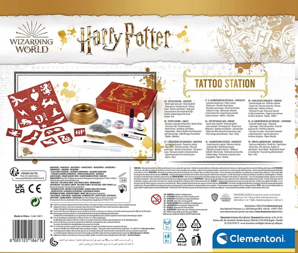 Forvandl din stil med magi ved hjælp af HARRY POTTER tatoveringsstudio fra Clementoni. Sættet indeholder alt til at lave midlertidige tatoveringer – fra glimmer og skabeloner til en speciel applikator formet som en tryllestøvsfjer. Alt kan opbevares i en praktisk kassette, så du altid har dine magiske accessories lige ved hånden.