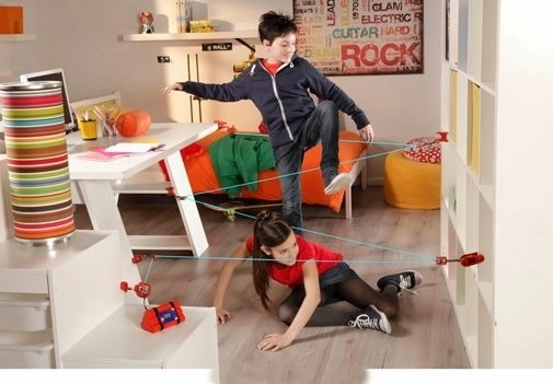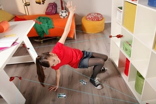 Røde enheder og klemmer danner et net af blå “lasere”. Børn træner smidighed og koordination, mens de har det sjovt i sikre hjemmerammer.