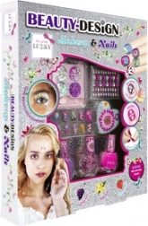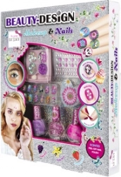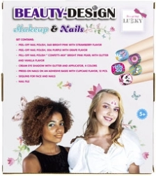 LUKKY Beauty Design Makeup & Negle-sættet indeholder alt, hvad børn behøver til deres første kreative makeup og neglepynt. De afpilbare lakker er lette at påføre og fjerne uden neglelakfjerner, de glitrende cremeskygger lyser enhver stil op, og klistermærker med “ædelsten” giver et legende skær.