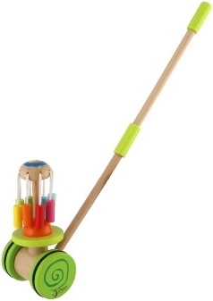 Den farverige træ-skubbewogn Classic World er det ideelle legetøj til små opdagelsesrejsende, der lærer at gå. Vognen er udstyret med en farverig karrusel, som drejer rundt og udsender behagelige lyde, der fanger barnets opmærksomhed og støtter deres gang.