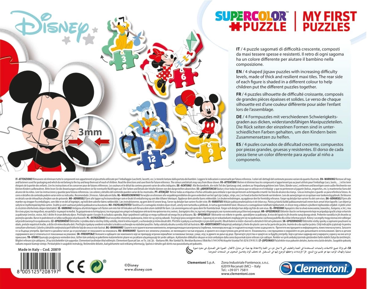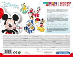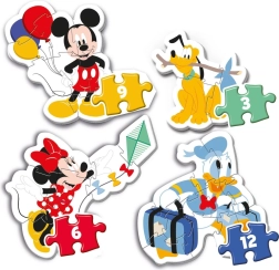 Oplev sjov med den populære helt MICKEY MOUSE! Sættet CLEMENTONI Mit første puslespil 4-i-1 byder på fire forskellige puslespil med stigende sværhedsgrad (3, 6, 9 og 12 brikker), så børn på en legende måde styrker koncentration og tålmodighed. Ekstra store og stærke brikker er nemme at holde og tåler daglig leg.