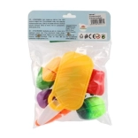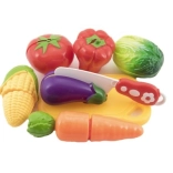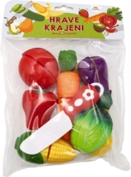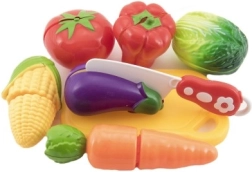 Dette farverige sæt til små kokke giver en realistisk madlavningsoplevelse. De enkelte stykker frugt og grøntsager er forbundet med velcro, så børn kan dele dem og samle dem igen ved hjælp af den medfølgende kniv. Det holdbare plastmateriale er let og sikkert til børns leg.
