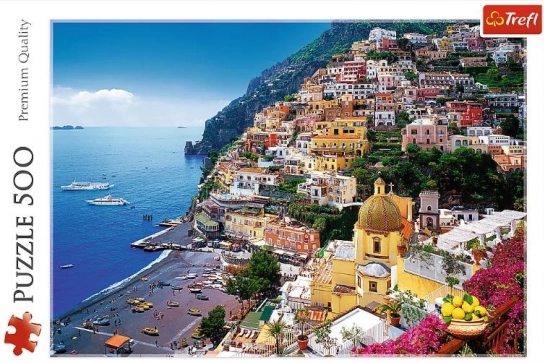 Puslespil med 500 brikker, der viser den maleriske italienske by Positano på Amalfikysten. Når det er samlet, måler billedet 48x34 cm.