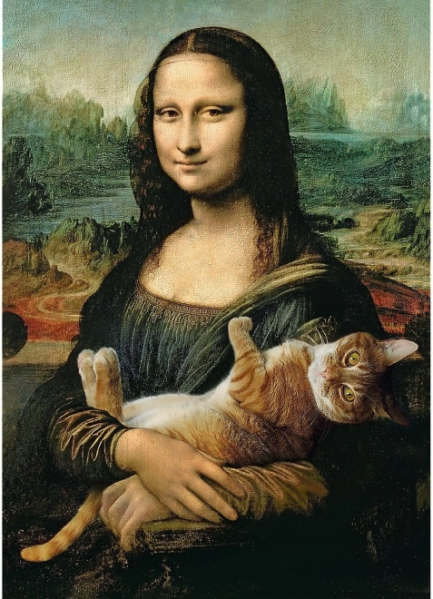 Motivet Mona Lisa med katten Mruczek tilføjer et sjovt og legende element til den klassiske kunstscene.