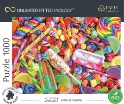 Dyk ned i farvernes verden med motivet af slikkepinde og slik, og læg et billede i størrelsen ca. 68,3 × 48 cm. Serien TREFL Unlimited Fit Technology gør det muligt at skabe dine egne puslespilscollager – det er dig, der sætter grænserne. En specialstansning sikrer, at forskellige motiver fra UFT-serien passer præcist sammen.