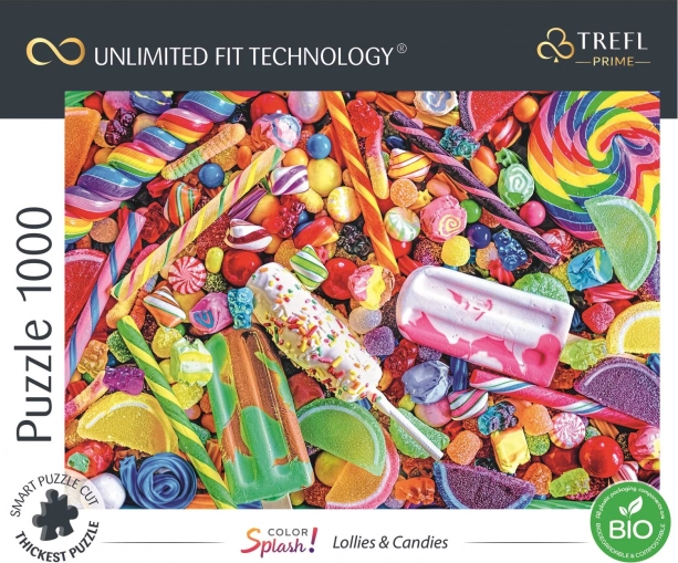 Puzzle TREFL UFT Color Splash 1000 brikker med motiv af slikkepinde og slik. Premium karton, unikke former, nem sammenkobling af motiver og miljøvenlig emballage.