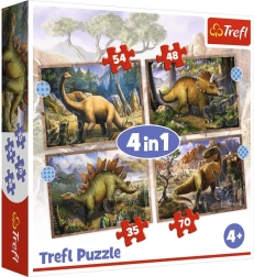 Puslespillet Spændende dinosaurer tilbyder fire billeder, som samlet måler 285 x 205 mm. Sættet indeholder forskelligt antal brikker – 35, 48, 54 og 70 – hvilket giver sjov for både yngre og ældre puslespilsfans.