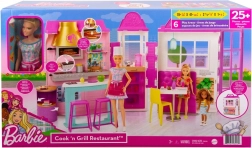 Oplev masser af sjov i den moderne BARBIE-restaurant med mere end 30 stykker tilbehør, 6 legezoner og en dukke i kokkeoutfit. Børn kan tage imod bestillinger, placere gæster, grille burgere, bage pizza med farveskift og servere desserter ved den roterende disk – alt sammen i ét stilfuldt sæt.