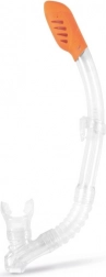 Den øverste stænkskærm (splash guard) begrænser vandindtrængning i røret, mens den klart orange spids øger synligheden ved overfladen. Den praktiske clips/klips til masken holder snorklen i korrekt position. Ideel til rekreativ svømning og snorkling for børn fra 8 år.
