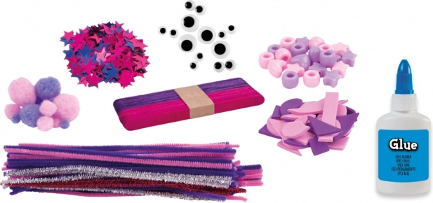 Piberensere, pomponer, skumfigurer, perler, selvklæbende øjne samt glimmerlim og almindelig lim – den ideelle kombination til et utal af kreative projekter.