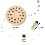 • Indhold i pakken: rund plade med huller, 24 træpinde i 6 farver, træterning med farver