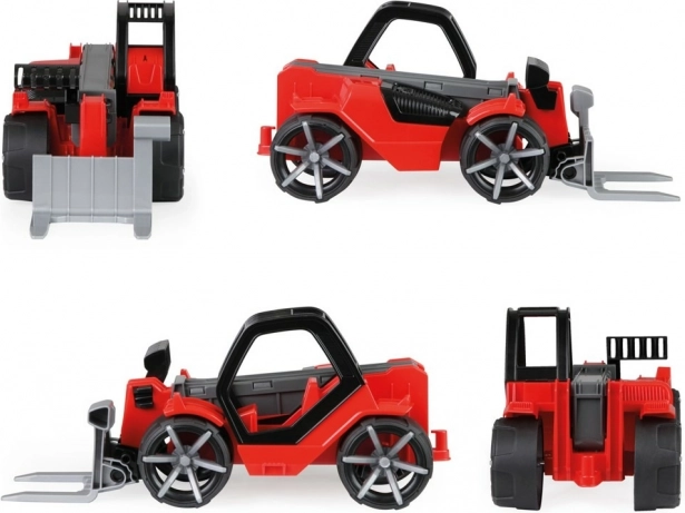 Denne teleskopiske læssemaskine er fremstillet af plast i høj kvalitet og tilbyder en solid konstruktion, der tåler intensiv leg. Takket være de gummibelagte hjul med stille gang er den også ideel til leg indendørs. Med den opklappelige kabine og den aktive figur kan børnene nemt forestille sig, at de er rigtige operatører af et bygge køretøj.