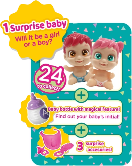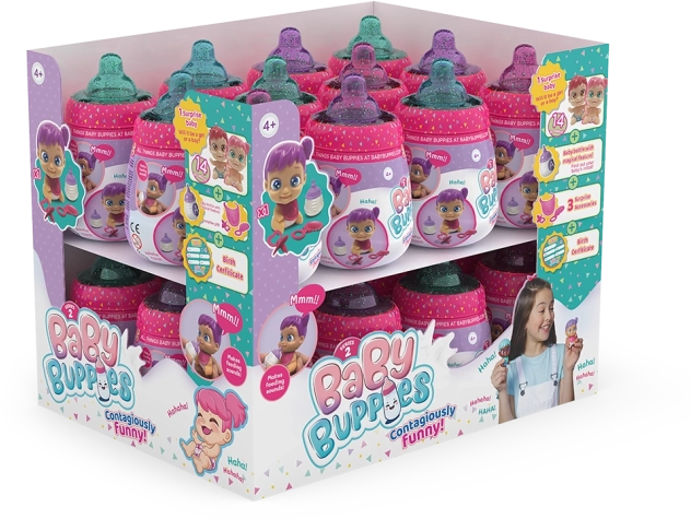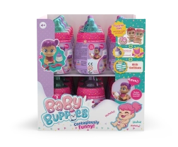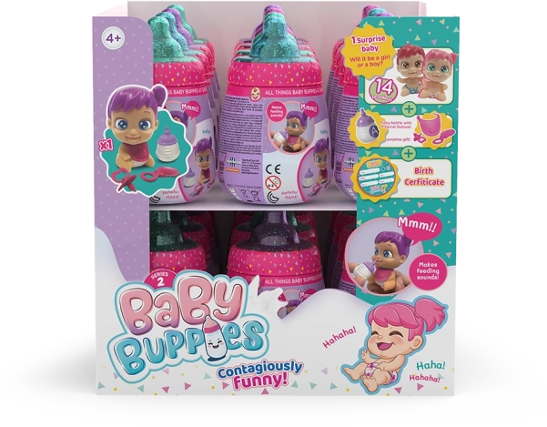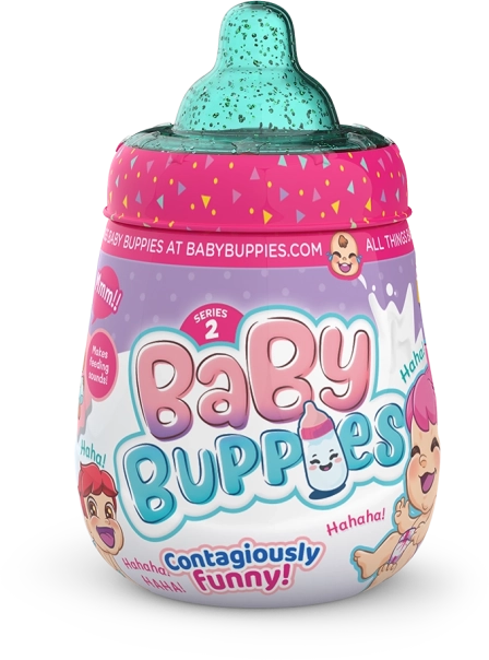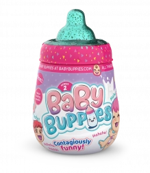Baby Buppies er sjove samlerdukker i en stilfuld emballage, der ligner en flaske. Hver baby kan pludre realistisk og grine, hvilket bringer følelser og masser af sjov ind i legen. Takket være de livlige farver og det nuttede design bliver de hurtigt et hit hos børn.