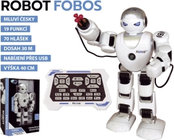 Rumrobotten FOBOS er en interaktiv ven, der taler tjekkisk, reagerer på fjernbetjening op til 30 m, kan programmeres med op til 50 trin, har 19 funktioner og 70 replikker. Den bevæger armene, går, drejer, affyrer 5 projektiler, og takket være USB-opladning er den hurtigt klar til aktion.
