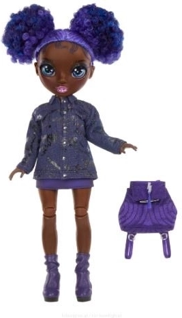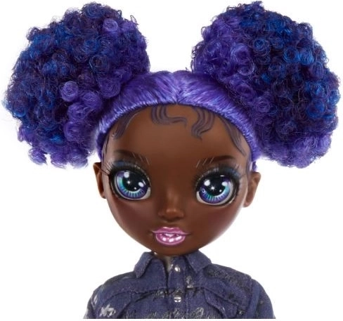 Dukken Krystal Bailey fra RAINBOW HIGH Junior High stråler i et trendy outfit i lilla og blå toner. Med bevægelige led og gennemtænkte tøjdetaljer er hun skabt til modestyling, historiefortælling og at udvikle fantasien. Den kompakte højde omkring 23 cm gør hende til den perfekte rejsemakker.