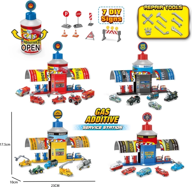 - Lille bil, brændstofstandere, slanger, trafikskilte og andet tilbehør