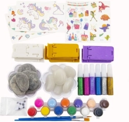 • Komplet sæt: sten, farver, pensler, paletter, glimmer, klistermærker, bevægelsesøjne og holdere