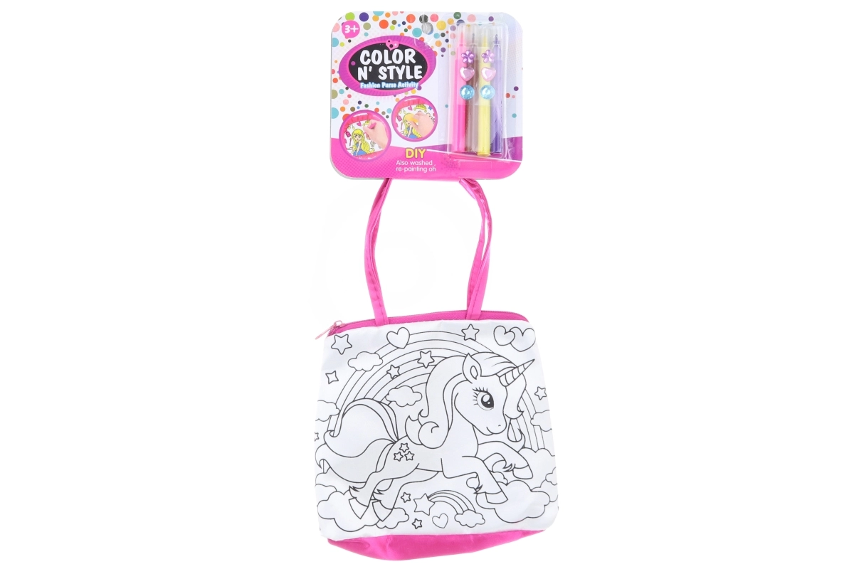 Kreativt sæt til små kunstnere: farvelægningshåndtaske på ca. 16 × 16 cm, som indeholder 4 specielle tekstiltuscher og dekorative sten. Ideel til at udvikle kreativitet, finmotorik og en original stil. Velegnet til børn fra 3 år.