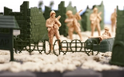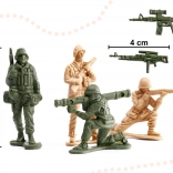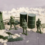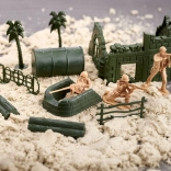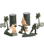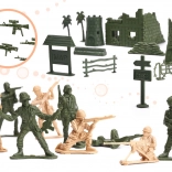 Indgår gør cirka 60 soldaterfigurer i forskellige positioner og rige komponenter til opbygning af en militærbase – tønder, hegn, forhindringer, palmer m.m. Figurerne er ca. 5 cm høje, står stabilt på flade overflader og er lette at placere.