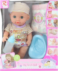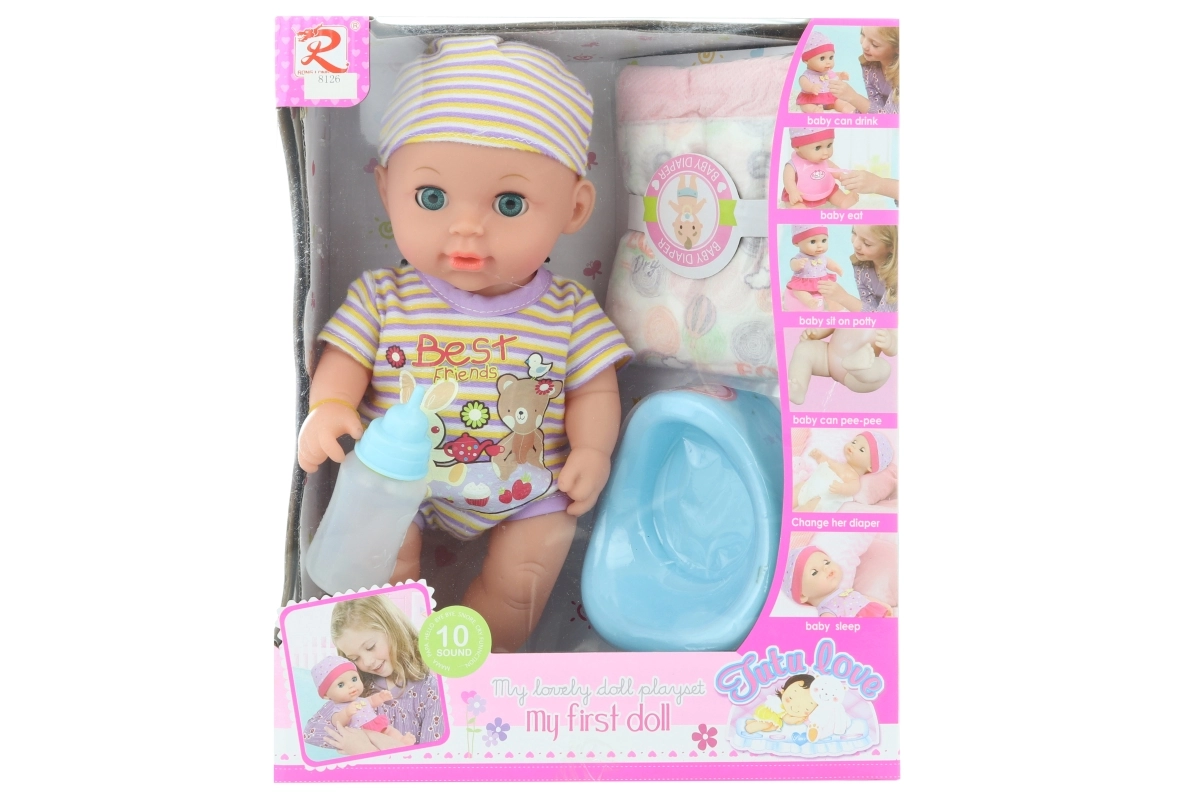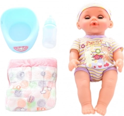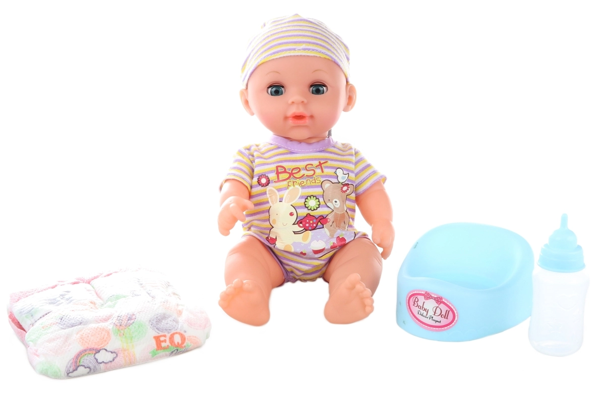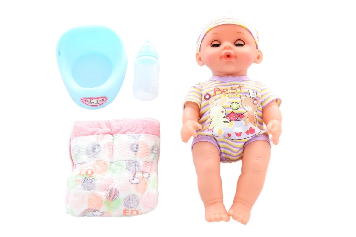 Pakken indeholder alt nødvendigt til timevis af sjov: ble, potte og sutteflaske. Dukken er let og nem at holde for mindre børn. De kompakte mål gør den velegnet både til rejser og opbevaring.