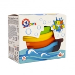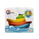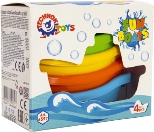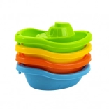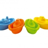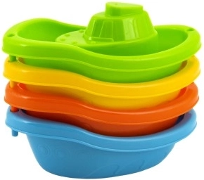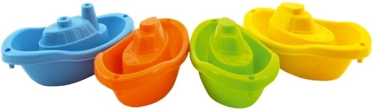 Sættet indeholder fire både i klare farver – blå, orange, grøn og gul – som nemt kan stables for enkel opbevaring. Formen og farverne stimulerer børns fantasi og kreativitet under vandlegen.