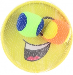 Sjovt sæt til leg ude og inde: plast catchball med gladt motiv og velcro. Indeholder 2 fangere og 2 bløde bolde til sikker gribning. Ideelt til børn fra 3 år, udvikler motorik, koordinering og teamsamarbejde.