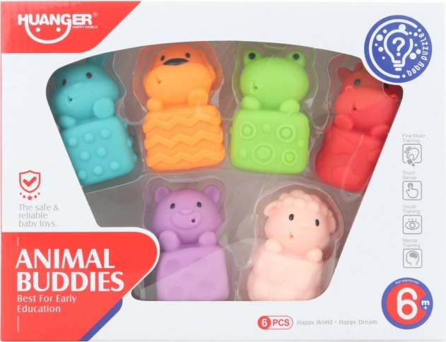 Sæt med gummidyr til vand (6 stk) for sjov badetid. Bløde, lette og sikre for børn fra 6 måneder. Ideel størrelse til små hænder.