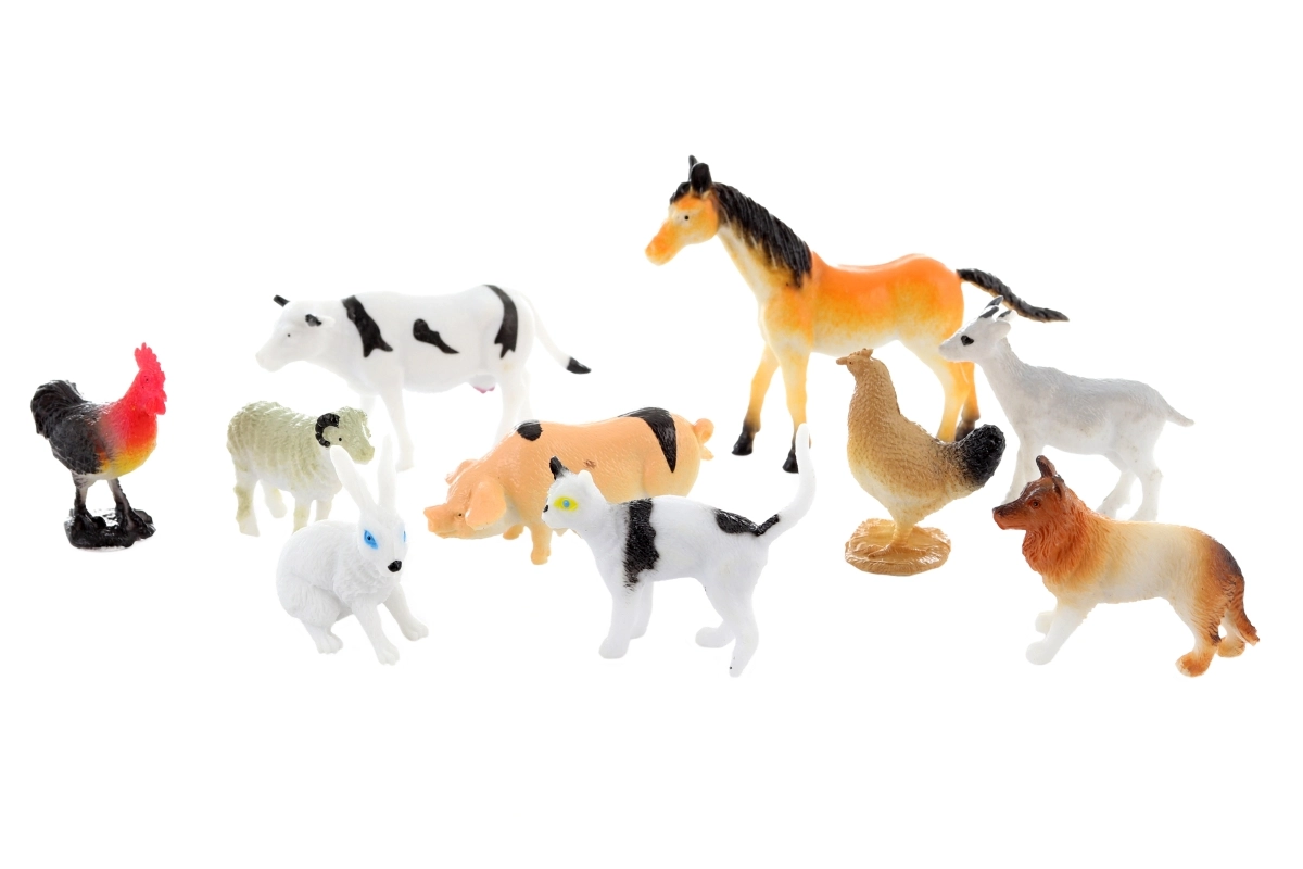 • Hvad finder du i pakken: hest, hund, kat, høne, hane, ko, vædder, ged, gris, kanin (i alt 10 stk.)