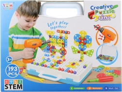 Dette veludstyrede skruemonteringssæt er ideelt til små konstruktører. Med den batteridrevne elektriske boremaskine og den manuelle skruetrækker kan børn nemt forbinde dele, skabe former og samle forskellige modeller. Den praktiske kuffert sikrer, at alle komponenter altid er lige ved hånden og opbevaret sikkert.
