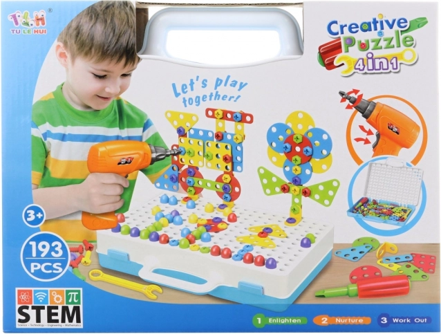 Sjovt og kreativt skruemonteringssæt med elektrisk boremaskine til børn fra 3 år, som indeholder i alt 193 dele til at bygge mange forskellige modeller. Sættet inkluderer en batteridrevet boremaskine, en skruetrækker og en praktisk plastkuffert til overskuelig opbevaring. Der medfølger også en vejledning for en nem start samt masser af muligheder for at udvikle finmotorik, kreativitet og logisk tænkning.