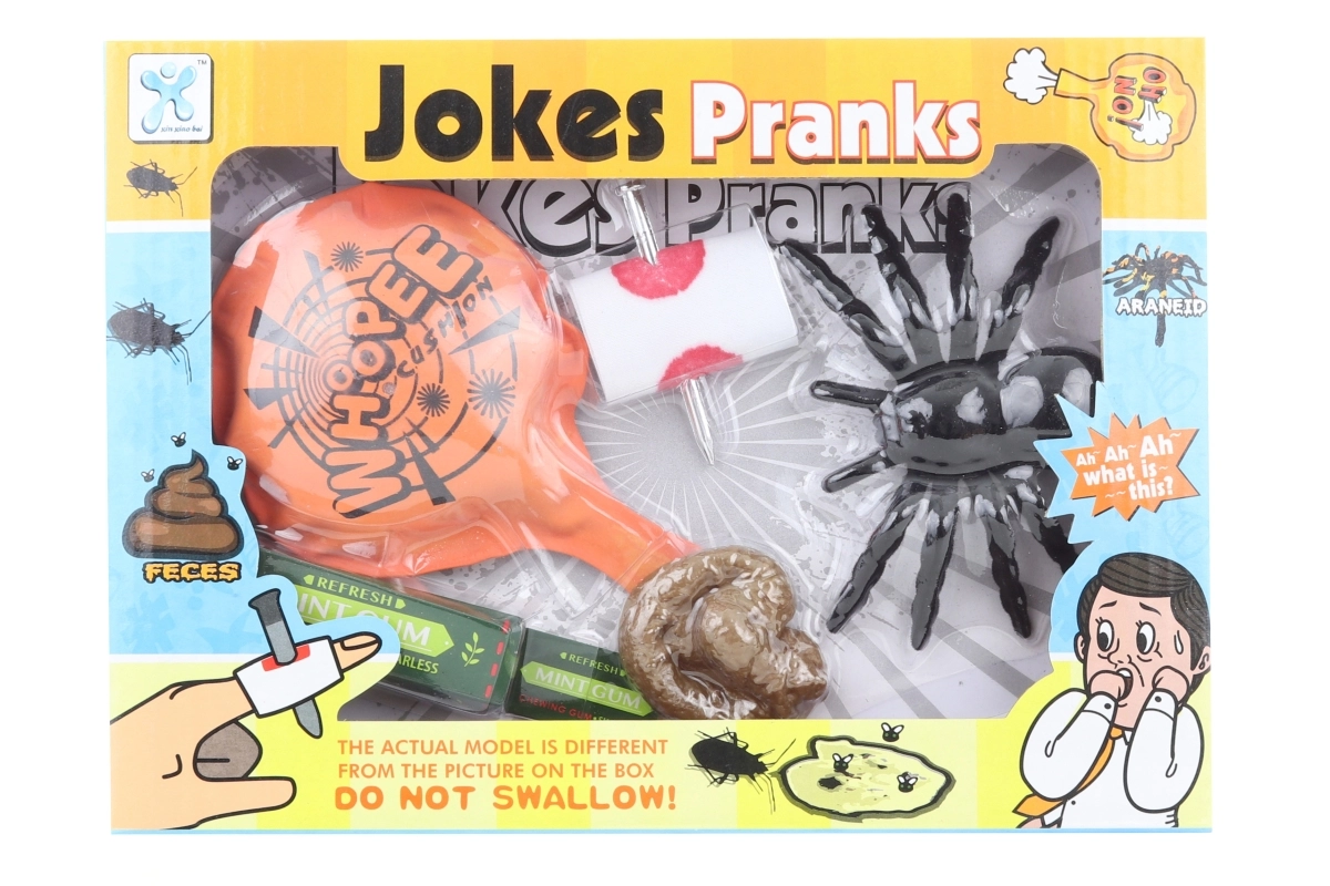 Et sjovt sæt med spøg- og skæmteting til både små og store spasmagere, der giver timevis af latter og overraskelser. Indeholder en pruttepude, falsk hundelort, edderkop, søm med forbinding og tyggegummi med fælde. Ideelt til fester, fødselsdage og sjov derhjemme. Velegnet til børn fra 3 år.
