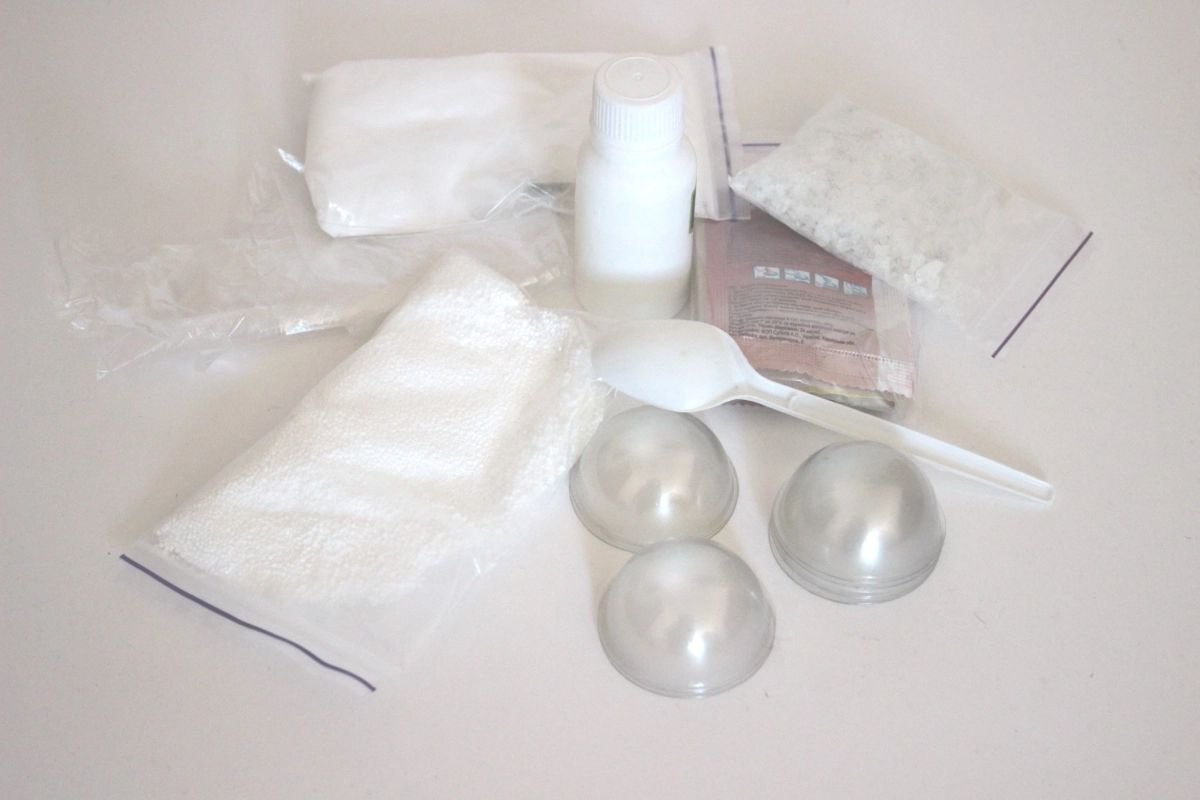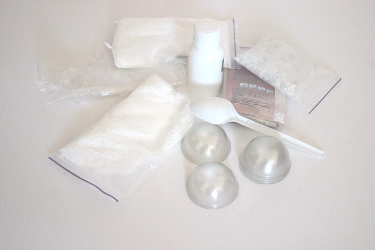 Natron, citronsyre, naturlig olie, havsalt, farve, handsker og yderligere redskaber