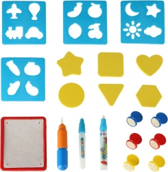 Pakken indeholder stempler, skabeloner, vandtuscher og pensel. Børn lærer former, farver og forbedrer finmotorikken.