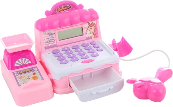 Det glade lyserøde kasseapparat med enhjørning forvandler ethvert legehjørne til en lille butik. Børn kan scanne “varer”, veje, regne og sikkert lægge de tjente penge i skuffen. Realistiske lyde, lys og display giver legen troværdighed og støtter naturlig læring af tal og enkel regning.