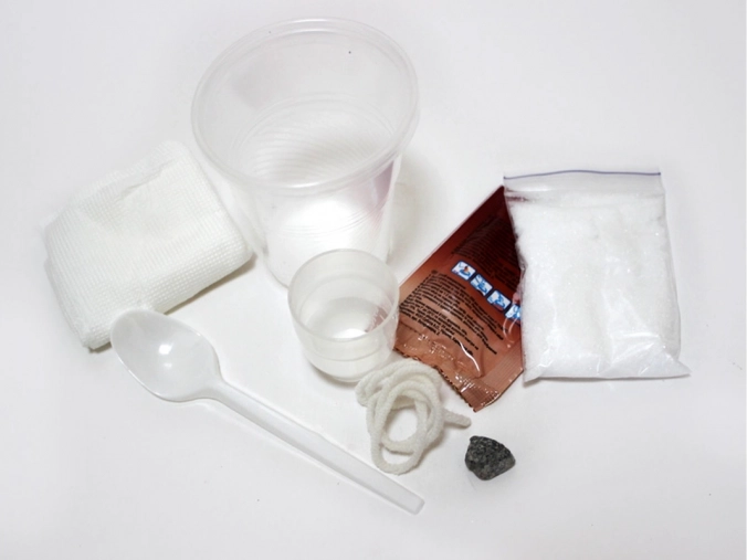 - Bægerglas, plastikkopper, ske, uldtråd, papirserviet, småsten