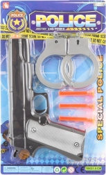 Politisættet indeholder en pistol, håndjern og 3 sugkop-ammunition. Emballagens mål ca. 31,5 x 19 x 3 cm. Alder 3+