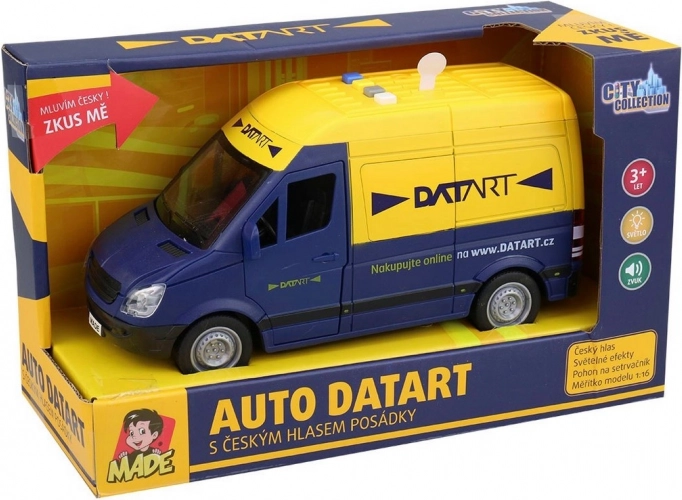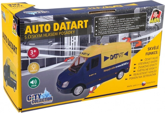 Den sjove DATART-varevogn fra MaDe vil glæde små bilfans med sit realistiske udseende, lys- og lydeffekter og chaufførens tjekkiske stemme. På taget finder du 4 knapper med replikker og motorlyd, for- og bagdøre kan åbnes, og småting kan opbevares i lastrummet. En friktionsmotor sørger for hurtig kørsel uden kompliceret betjening.