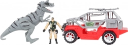 Dette sæt indeholder en grå dinosaur, et terrængående køretøj og en figur i militærdragt for den ultimative legeoplevelse.