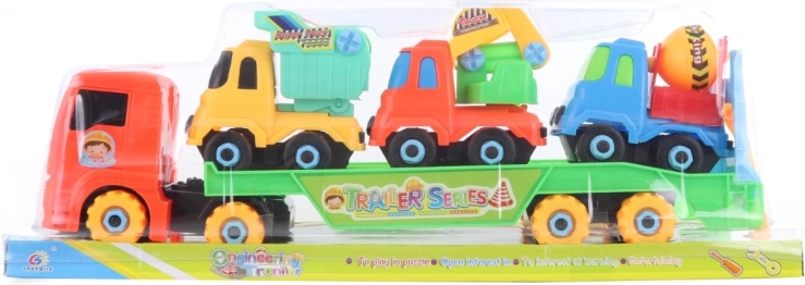 Skruelastbil med tre byggebiler. Holdbar plast, udvikler motorik og kreativitet. Lastbilmål 39×9×7 cm. Ideel til børn fra 3 år.