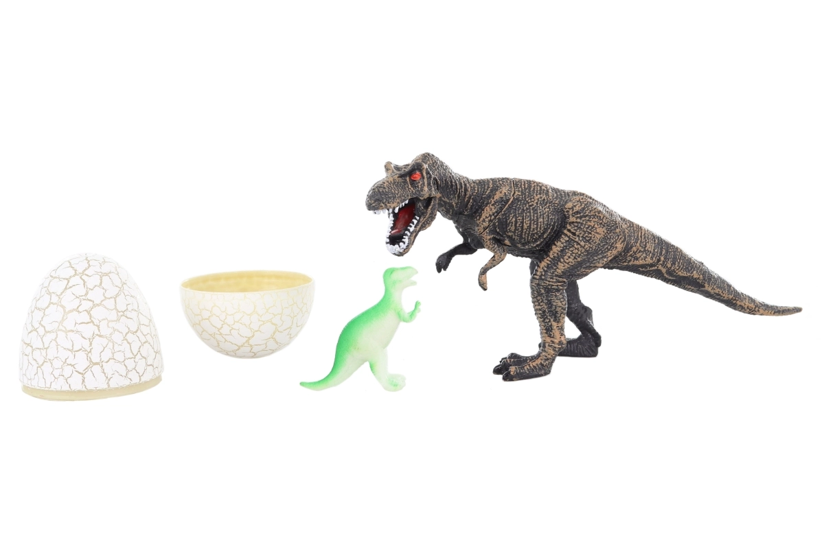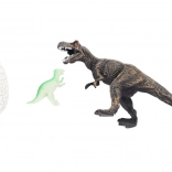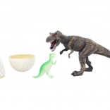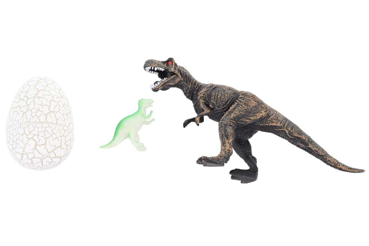 - Dinosaurfigur (T‑Rex) og sprækket æg