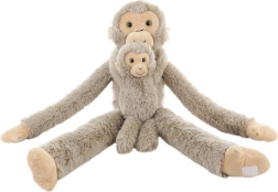 Denne bløde plysbamse-abe med unge vil vinde hjertet hos enhver lille dyreven. Lange, fleksible arme med velcro gør det muligt for aben at kramme barnet eller hænge, mens den aftagelige unge udvikler role-play og finmotorik.