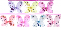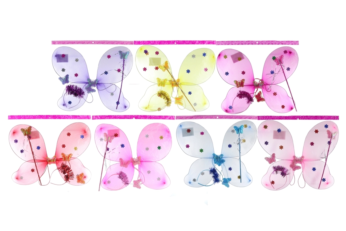 Et sødt sæt til små feer og prinsesser med sommerfuglevinger med blomster, hårbøjle og tryllestav. Ideelt til karneval, fester, børnefødselsdage og udklædning derhjemme. Let, behageligt og egnet til børn fra 3 år.