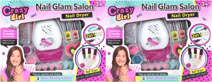 Børnenes neglestudie med tørremaskine, 3 lakker, neglefil og glimmer. Kreativt sæt til piger fra 3 år. Strøm: 2× AAA. Fantastisk gave til små stylister.