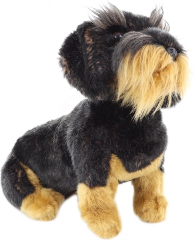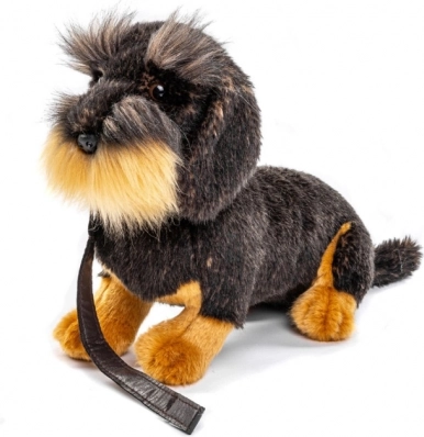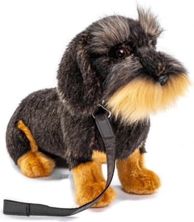 Denne plysdachshund vil vinde både børns og voksnes hjerter med sit nuttede udseende og kvalitetsforarbejdning. Den bløde pels, de udtryksfulde øjne og de kontrastfulde brune detaljer giver legetøjet et realistisk præg, mens den korte snor understøtter rolleleg og omsorg for en "kæledyr".
