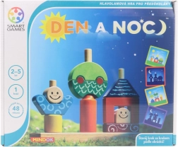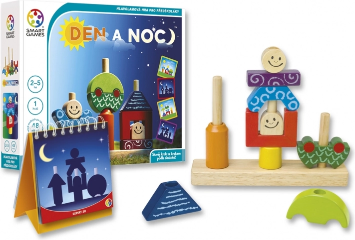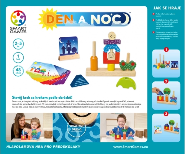 Dag og nat er et smart designet logisk spil for én spiller, som guider børn fra de første enkle konstruktioner til mere krævende rumlige opgaver. På dagkortene ses alle detaljer, mens natkortene kun viser silhuetter – barnet træner dermed fantasi, opmærksomhed og finmotorik.