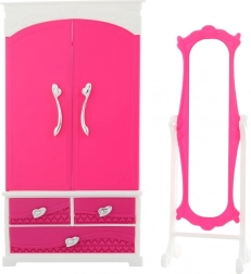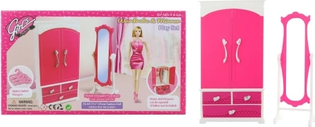 GLORIE garderobeskab med spejl er et fantastisk tilbehør til dukkernes univers. Det tilbyder åbningsbare døre og skuffer til opbevaring af kjoler og tilbehør samt praktiske bøjler til at hænge favoritoutfits på. Takket være det medfølgende spejl kan børn nemt kombinere og prøve nye stilfulde kreationer.