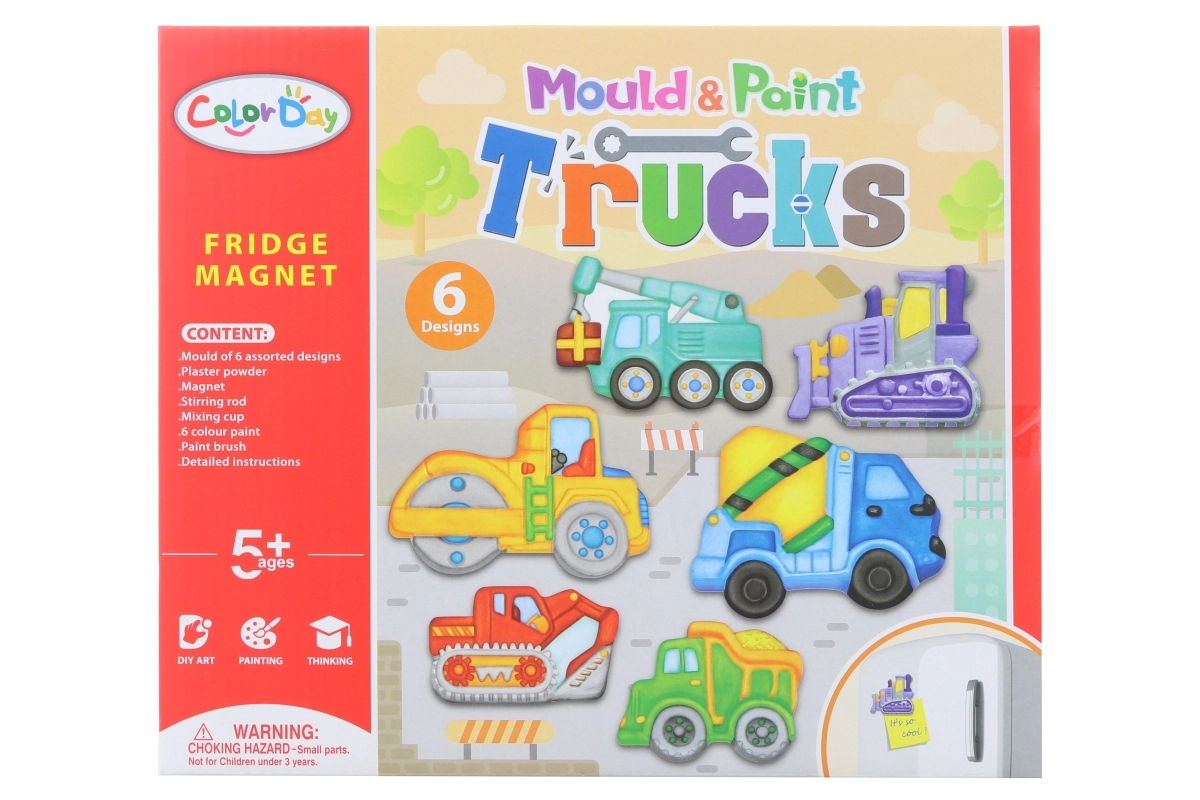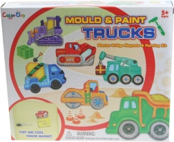 Forvandl skabelsen til et byggeeventyr. Med dette sæt støber børn gipsmagneter i en form med 6 motiver af byggemaskiner, farvelægger dem med de medfølgende farver og skaber med hjælp fra magneterne festlige dekorationer til køleskabet eller en magnettavle.