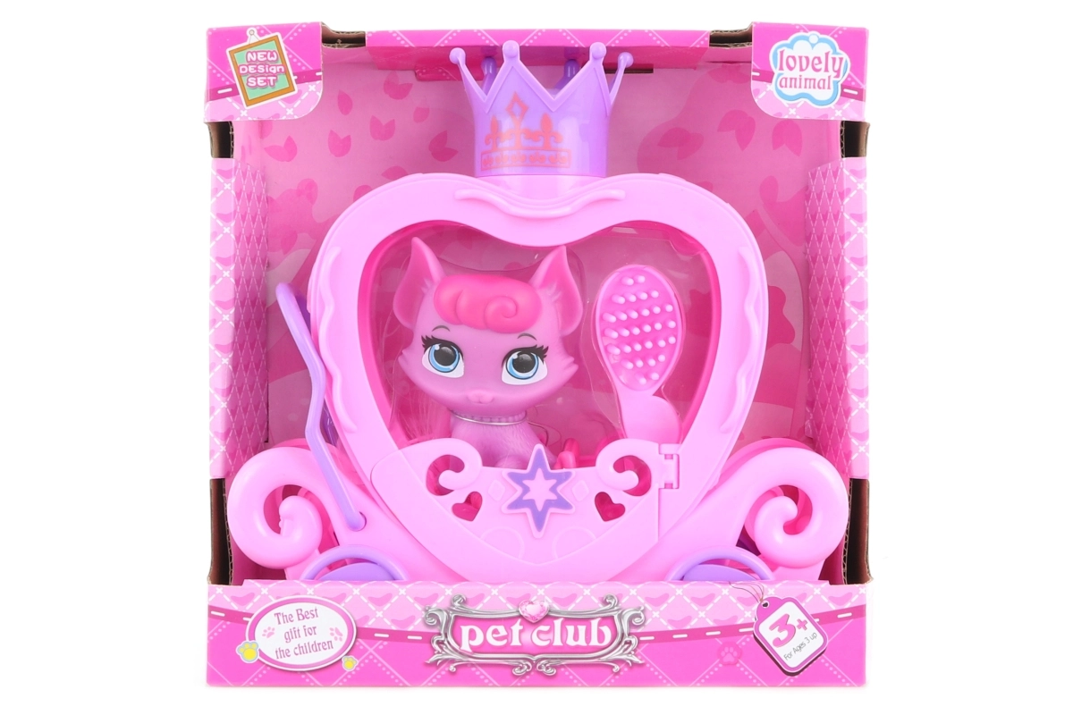 Et sødt sæt til små dyreelskere: killing med barnevogn og tilbehør til kreativ leg. Pakken indeholder en killing med kam til halen og en barnevogn med krone. Ideel til børn fra 3 år og til at udvikle fantasien.