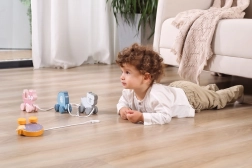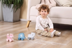 Takket være de bevægelige hjul og muligheden for at trække, støtter legetøjet fysisk udvikling og koordination.